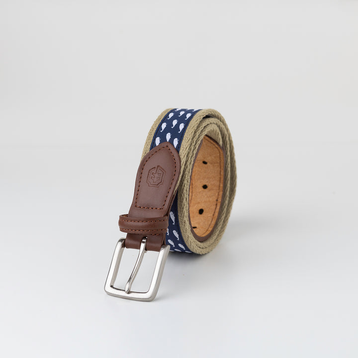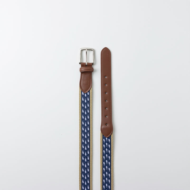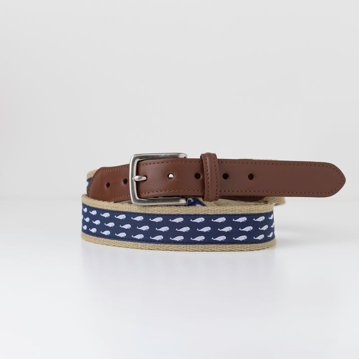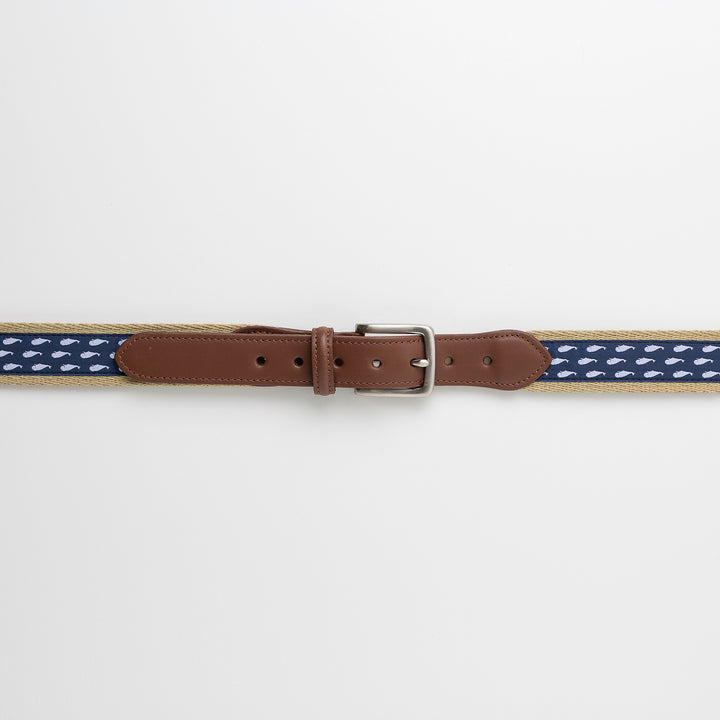 Make a splash with our Whale Print Belt! Featuring a playful whale motif, this 1.38" (35mm) wide belt effortlessly blends coastal charm with everyday style, making it the perfect accessory for any casual occasion. Crafted with a durable cotton blend strap and finished with premium vegan leather tabs, it ensures long-lasting comfort and quality. A sleek nickel-finish buckle adds a refined touch, ideal for pairing with your favorite seasonal attire.