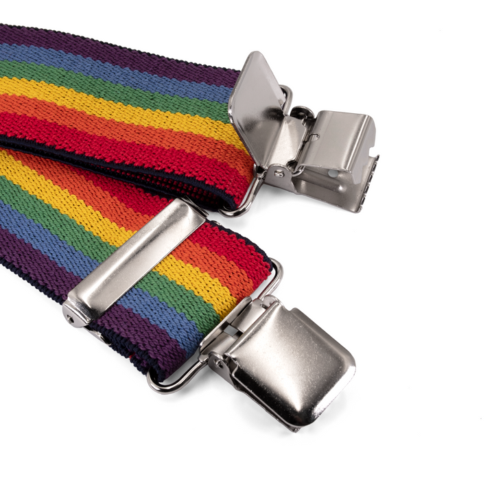 The vibrant rainbow stripe design adds personality and flair, while strong metal clips ensure a dependable hold on your trousers. Perfect for casual outfits, parties, parades, or simply showing off your fun side, these suspenders combine playful style with everyday practicality.